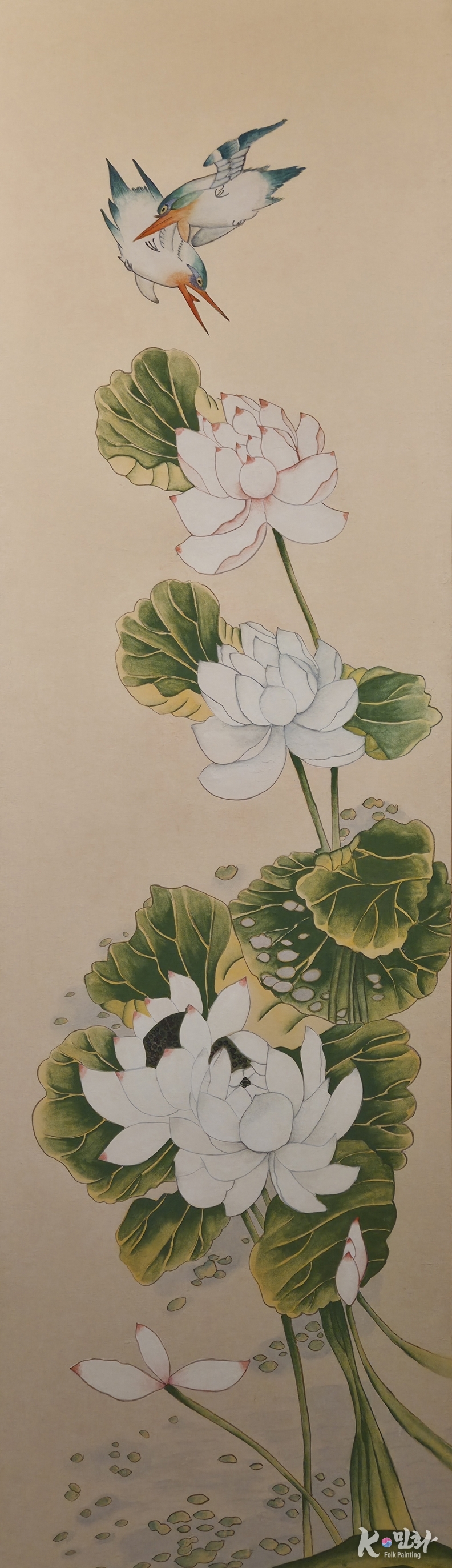 세로로 길게 뻗은 화면에는 연잎과 연꽃이 층층이 배치되고, 그 꼭대기에는 물총새 한 쌍이 날아든다. 이는 단순한 자연 묘사가 아니다. 삶의 단계와 마음의 이동 경로를 은유적으로 그린 하나의 서사다.
