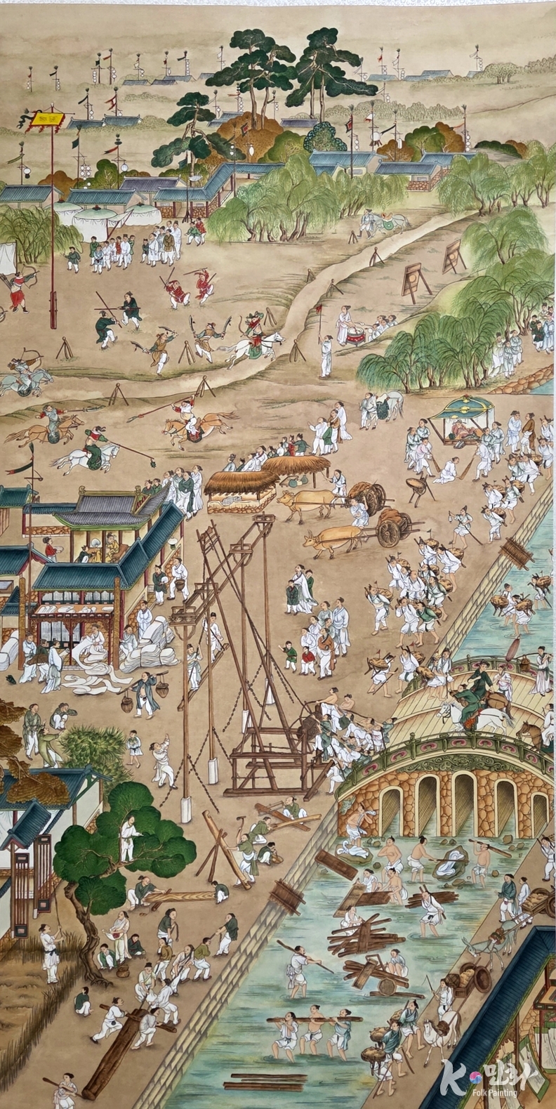 특히 이 작품에서 인상적인 것은 ‘협력의 장면들’이다. 통나무를 나르는 손, 다리 아래서 물을 가르는 몸, 장터에서 음식을 나누는 얼굴들. 태평은 정적靜的 상태가 아니라, 끊임없이 움직이며 조율되는 역동적 균형이다. 그래서 이 그림은 평화롭지만 정지돼 있지 않다.