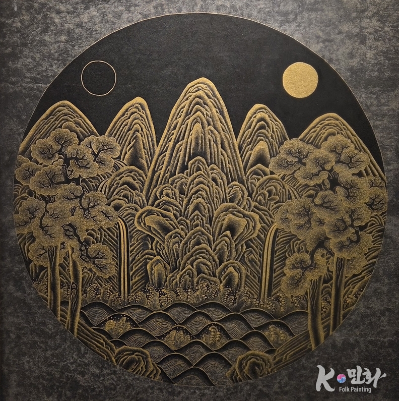 '황금일월오봉도'는 전통 일월오봉도의 상징 체계를 바탕으로, 금빛과 원형 구도를 통해 중심과 질서의 의미를 재해석한 작품이다.