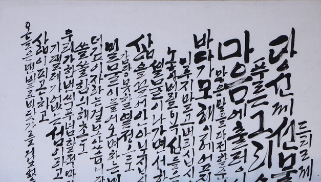 K-그라피 이성준 기자 | 이 글씨 앞에 서면, 우리는 먼저 ‘읽지’ 않는다. 대신 느낀다. 글자는 의미로 다가오기 전에, 기류氣流처럼 몸에 닿는다. 김태곤 작가의 ‘바람의 자유’는 문장을 쓰지 않는다. 그는 바람이 지나간 흔적을 남긴다. 먹은 획이 아니라, 숨의 방향으로 번지고 색은 칠해진 것이 아니라 스며든다. 붉은 바탕은 고요하지 않다. 마치 오래된 시간 속에 쌓인 기억처럼, 번짐과 얼룩은 질서 없이 겹쳐 있다. 그 위를 가로지르는 푸른 획, 그 획은 결코 단정하지 않다. 흔들리고, 갈라지고, 멈칫한다. 그러나 바로 그 불안정함이 이 작품을 자유롭게 만든다. “꽃잎이 나비가 되어 날아가는 바람 속에 먼 바다도 파도소리가 들린다.” - 지안스님 詩 중에서 시의 문장은 작품 아래에 조용히 놓여 있지만, 실은 이미 화면 전체에 흩어져 있다. 글씨는 꽃잎이 되고, 꽃잎은 나비가 되며, 나비는 바람을 따라 사라진다. 이 작품에서 ‘바람’은 자연이 아니다. 집착을 내려놓은 상태, 형태를 고집하지 않는 마음, 머무르지 않으려는 의지다. 그래서 이 글씨는 말한다. 자유란 더 멀리 가는 것이 아니라, 붙잡지 않는 것이라고. 작가 노트 | 김태곤 명인 나는 글자를 쓰기보