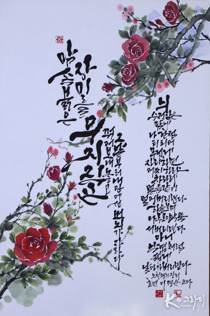 K-그라피 이성준 기자 | 장미는 아름다움의 상징이지만, 동시에 상처의 이름이다. 이명순 작가의 K-그라피 작품 ‘노천명의 장미’는 그 상처를 감추지 않는다. 오히려 “맘 속 붉은 장미를 우지직 끈 꺾어 보내 놓고”라는 시어처럼, 한 번의 결단과 파열로부터 시작된다. 이 작품에서 붓은 쓰다듬지 않는다. 꺾고, 밀어내고, 비워낸다. 그 결과 화면에는 화려함보다 번뇌가 자라는 시간이 남는다.