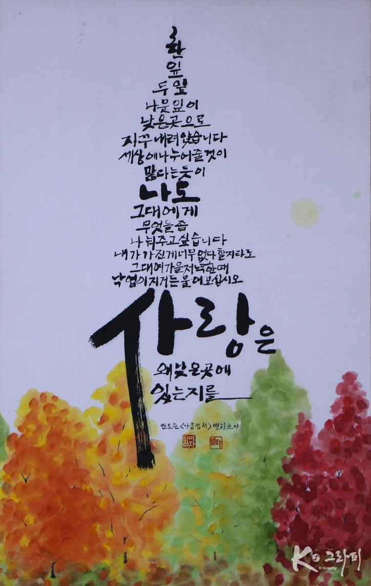 K-그라피 이성준 기자 | 가을은 내려앉는 계절이다. 잎은 위에서 아래로, 마음은 바쁨에서 성찰로 이동한다. 김미자 작가의 K-그라피 작품 ‘안도현의 가을엽서’는 이 ‘내려앉음’을 역설적으로 탑의 형식으로 쌓아 올린다. 시의 행들은 위로 향하지만, 뜻은 낮은 곳을 가리킨다. 그 긴장과 모순이 이 작품의 미학이다.
