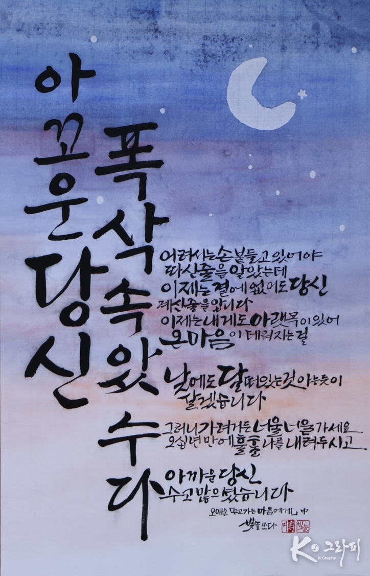 K-그라피는 글씨를 ‘보여주는’ 기술이 아니라, 마음을 머물게 하는 방식이다. 이 작품에서 글자는 정보가 아니라 호흡이다. 획의 시작과 끝, 멈춤과 번짐은 시의 행간을 시각화한다. 반달과 여백은 문장 밖의 문장은 말하지 않은 것들이 머무는 자리다.