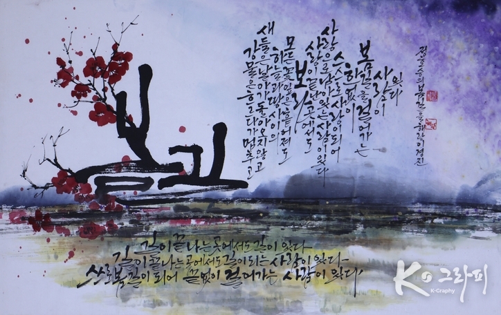 K-그라피의 미학은 여기서 분명해진다. 글씨는 읽히기 위해서만 존재하지 않는다. 획은 감정의 밀도이고, 번짐은 기억의 방식이며, 여백은 침묵의 설득이다. 이경진 작가의 ‘봄길’은 시를 ‘옮긴’ 작품이 아니라, 시가 지나간 자리에서 다시 태어난 하나의 길이다. 끝난 사랑의 잔해 위에서도, 우리는 여전히 걷는다. 그 걷는 태도 자체가 봄이다.