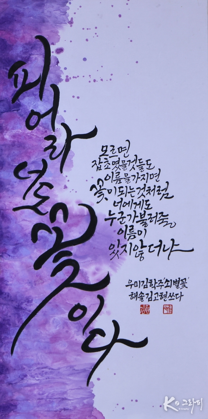 김고현 작가의 K-그라피는 이 시의 메시지를 ‘부르는 행위’로 확장한다. 화면을 채우는 보랏빛 번짐은 이름 없는 시간의 층위이며, 그 위에 얹힌 굵은 획은 호명呼名의 순간이다. 글씨는 단정하지 않다. 번지고 흔들린다. 그러나 그 흔들림 속에서 문장은 또렷해진다. 존재는 완벽해서가 아니라, 불려서 선명해진다는 사실이.