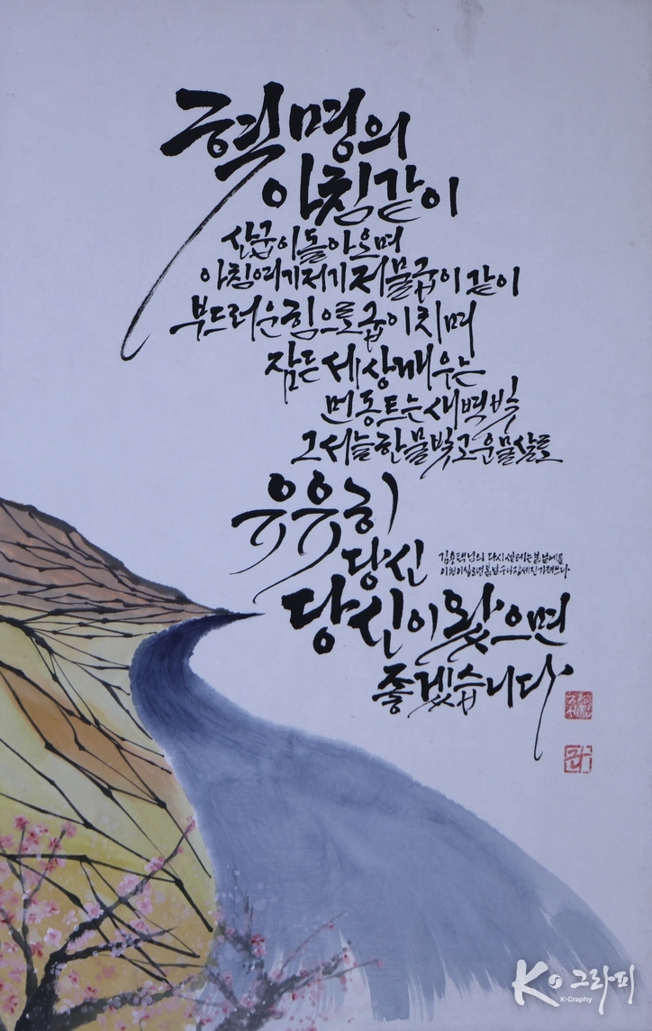 장세진 작가의 K-그라피는 이 시의 정서를 ‘길’로 번역한다. 작품 아래에서 위로 흐르는 곡선의 길은 단순한 풍경이 아니다. 그것은 우리가 수없이 포기했던 마음을 다시 건너는 내면의 동선이다. 논두렁처럼 굽이진 길, 아직 차가운 물빛을 품은 강, 그리고 끝내 피어나는 봄꽃이 모든 요소는 삶이 늘 곧게만 흐르지 않음을 인정하면서도, 결국은 앞으로 나아간다는 믿음을 말한다.