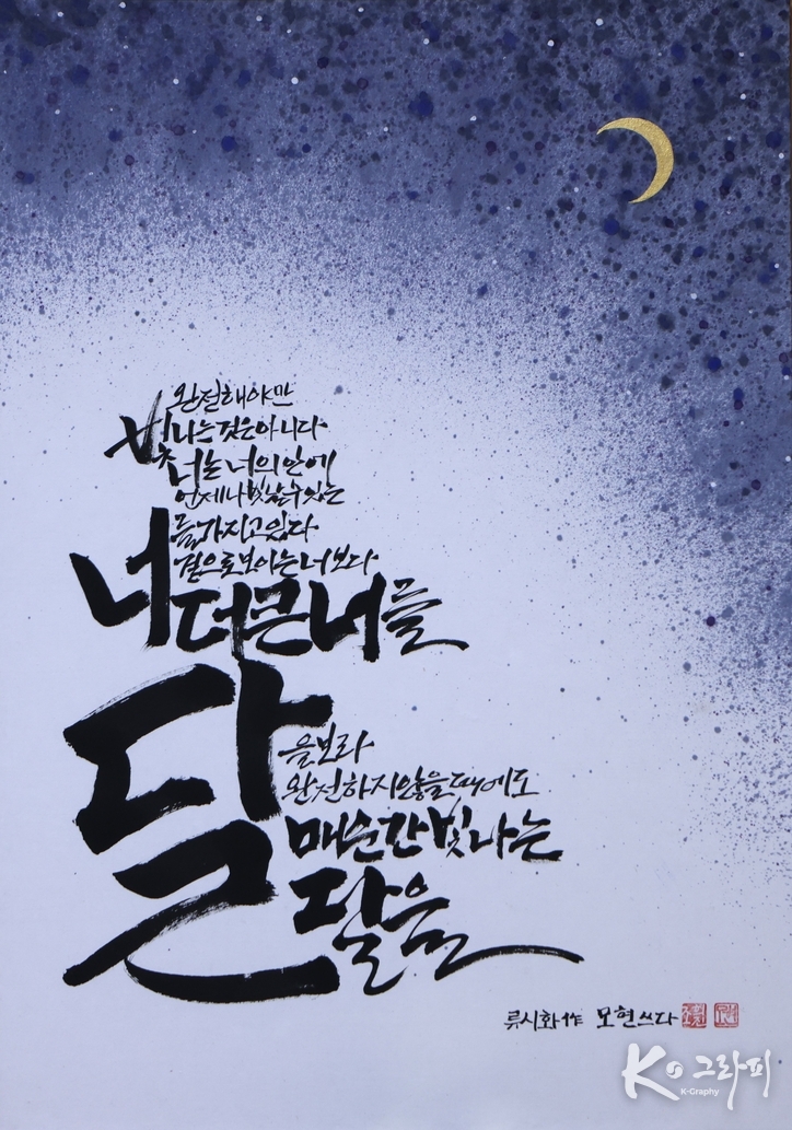 이 작품에서 ‘너’는 특정한 누군가가 아니다. 우리 모두다. 겉으로 보이는 너보다 더 큰 너, 아직 드러나지 않았지만 이미 안에 있는 가능성, 그 가능성이야말로 이 시가 가리키는 빛이다. 조희진 작가는 K-그라피의 언어로 옮겨진 이 시는 읽히기보다 보이며, 이해되기보다 체감된다. 달은 설명되지 않고, 대신 바라보게 만든다. 그 바라봄 속에서 우리는 스스로에게 묻는다. 지금 이 모습 그대로도, 나는 빛나고 있는가.