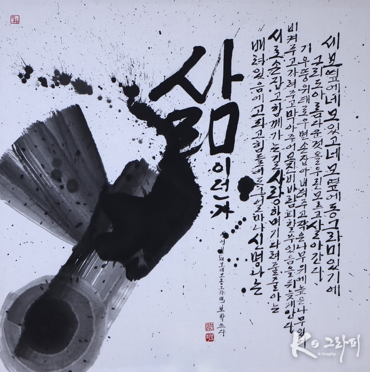 K-그라피의 언어로 볼 때 이 작품은 ‘쓰기’보다 놓기에 가깝다. 획은 다듬어지지 않았고, 균형은 의도적으로 깨져 있다. 그러나 그 불균형 속에서 화면은 오히려 안정된다. 세모가 날카로움을, 네모가 버팀을, 동그라미가 포용을 맡듯, 삶 또한 서로 다른 성질들이 맞닿아 있을 때 비로소 완성된다는 메시지가 자연스럽게 드러난다.