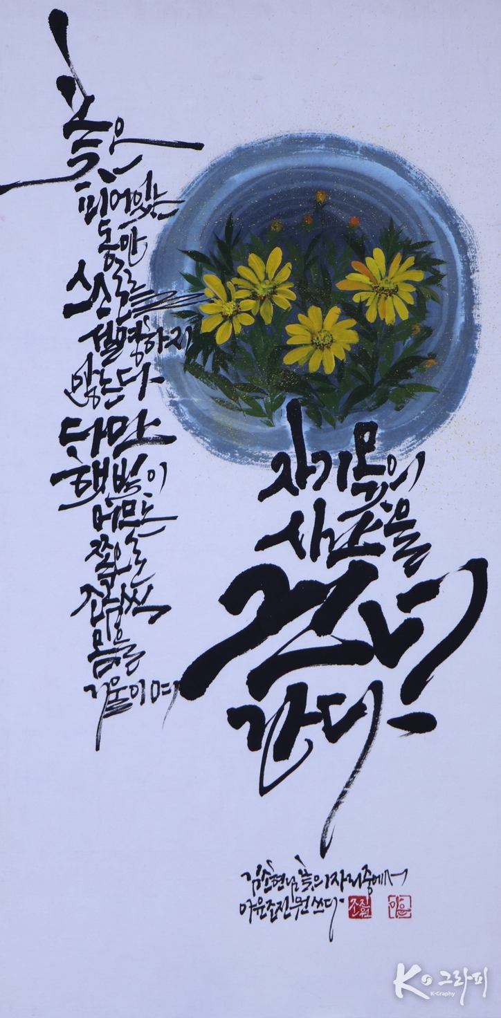 이때 K-그라피는 문학과 회화의 경계를 넘어서 태도의 기록이 된다. 꽃이 햇빛을 향해 기울이듯, 글씨 역시 의미를 향해 조금씩 방향을 잡는다. 그 미세한 이동이 쌓여, 하나의 깊은 정서를 만든다. 이것이 K-그라피가 지닌 동시대적 감각이다. 말보다 느리고, 주장보다 낮으며, 그만큼 오래 남는 감각 이기에...