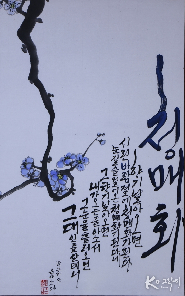 은새 인복 작가의 K-그라피는 이 시의 정서를 여백과 절제된 선으로 옮긴다. 화면 한쪽에서 비스듬히 뻗은 매화 가지는 혹독한 겨울을 견뎌온 시간의 궤적처럼 보이고, 그 끝에 맺힌 작은 꽃들은 침묵 속에서 완성된 존재의 증거다. 굵고 담담한 획은 바람을 견딘 몸의 기억을 닮았고, 여백은 눈길 위에 남은 숨결처럼 고요하다.