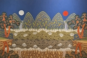 K-민화 이성준 기자 | 이 그림 앞에 서면 먼저 고요한 질서가 다가온다. 요란한 기교도, 감정을 앞세운 서사도 없다. 대신 화면 전체를 지배하는 것은 오래된 약속처럼 견고한 균형이다. 조경선 작가의 '일월오봉도'는 ‘왕의 병풍’이라는 익숙한 틀을 빌려, 그보다 훨씬 근원적인 질문으로 우리를 이끈다. 누가 중심인가가 아니라, 무엇이 중심인가라는 질문이다. 일월오봉도는 본래 권력의 상징이었다. 해와 달, 다섯 봉우리, 소나무와 물이 질서는 왕을 우주의 중심에 놓기 위한 시각적 장치였다. 그러나 조경선의 화면에서 왕은 사라진다. 대신 남는 것은 질서 그 자체다. 위와 아래가 뒤집히고, 현실과 반영이 맞물리며, 하늘과 땅은 서로를 비춘다. 중심은 비어 있고, 그 자리에 우주의 리듬이 놓인다. 특히 수면水面을 가로지르는 반복의 파동은 인상적이다. 겹겹이 쌓인 물결은 단순한 장식이 아니라 시간의 층위처럼 읽힌다. 흐르되 무너지지 않고, 반복되되 지루하지 않다. 이는 민화가 가진 가장 큰 미덕과 질서를 통한 안정을 현대적으로 번역한 결과다. 자연은 요동치지만, 그 요동 안에는 언제나 법칙이 있다. 색의 선택 또한 치밀하다. 짙은 남색의 하늘, 절제된 황토와 녹청, 그리