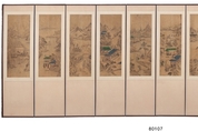 K-민화 이존영 기자 | 소장품설명고사(故事)에 등장하는 인물과 배경을 그린 10폭 병풍. 지본채색(紙本彩色). 화폭(세로 93.5 가로 32.8). 각 폭마다 산수를 배경으로 밭 가는 사람, 말 타는 사람 등이 묘사됨. 화면 주위는 비단으로 장황(裝潢)됨. 나무틀 상하단 모서리에 장석(裝錫)이 부착됨. 1폭 뒷면 좌측 상단에 '民畵十曲屛風'이 묵서된 제첨(題簽)이 붙어 있음. (접힌 크기 : 두께 6.5, 세로 169.2, 가로 47.3). 민화십곡병풍(民畵十曲屛風), 고사도(故事圖), 인물화(人物畵) 국적/시대한국 - 조선 주생활 - 생활용품/가전 - 장식용구 - 병풍 재질종이 크기세로 169cm, 가로 458.6cm 소장품번호민속 80107