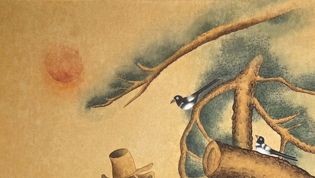 K-민화 이성준 기자 | 이 그림 앞에서는 누구도 서두르지 않게 된다. 노지영 작가의 '화조도'는 한 계절의 풍경을 보여주는 데서 멈추지 않고, 생명이 머무는 방식을 조용히 들려준다. 화면을 가득 채운 매화 가지와 꽃, 그리고 저마다의 자리를 지키는 새들은 ‘움직임’보다 ‘공존’을 먼저 말한다. 화조도는 민화에서 가장 인간적인 장르다. 왕도, 신선도, 호랑이도 아닌 꽃과 새. 일상의 풍경이자 누구나 이해할 수 있는 자연의 언어다. 그러나 노지영의 화조도는 단순한 길상吉祥의 나열이 아니다. 이 작품의 중심에는 하나의 나무가 서 있고, 그 나무를 기준으로 수많은 생명이 각자의 방향으로 흩어지며도 질서를 잃지 않는다. 나무의 줄기는 굽이치되 흔들리지 않는다. 세월의 흔적처럼 패인 옹이와 뒤틀린 가지는 생의 굴곡을 닮았고, 그 위에 핀 매화는 시련 이후에 오는 단단한 아름다움을 상징한다. 꽃은 만개했지만 과시하지 않고, 새들은 날지만 소란스럽지 않다. 모두가 자기 몫의 봄을 살고 있을 뿐이다. 특히 눈에 띄는 것은 새들의 배치다. 까치, 제비, 원앙, 이름 모를 작은 새들까지 이들은 같은 방향을 보지 않는다. 어떤 새는 날고, 어떤 새는 쉬며, 어떤 새는 서로를 바