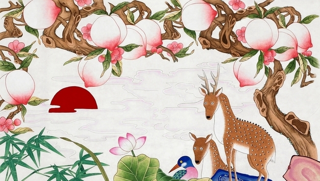 K-민화 김학영 기자 | K-민화 전문 작가 담화총사의 신작 『복사꽃 미소에 머문 사슴』이 한국 전통 민화의 길상적 상징과 현대적 감수성을 절묘하게 조화시키며 주목을 받고 있다. 이번 작품은 복숭아꽃(복사꽃), 연꽃, 사슴 등 민화 속 대표적인 길상 소재를 통해 복福과 수壽, 평화와 생명의 메시지를 전한다. 담화총사는 이를 전통적인 소재 해석에 머물지 않고, 신화적 서사와 정적인 자연의 순간을 결합해 감성적으로 풀어내고 있다. 그림에 담긴 이야기는 ‘신과 인간의 경계가 열려 있던 아득한 옛 시절’에서 출발한다. 영원의 숲을 떠난 사슴 한 쌍이 인간 세상의 끝자락에 이르렀고, 그들이 도착한 곳은 연꽃이 피어나는 고요한 연못가다. 그곳에서 복사꽃은 마치 미소 짓듯 활짝 피고, 붉은 해가 떠오르며, 자연은 한순간 축복의 메시지를 전한다. 이 장면은 단지 시적인 풍경이 아닌, 작가가 전하고자 하는 이상향의 형상화다. 하늘에서는 물새가 내려와 노닐고, 모란과 국화, 파초와 조롱박까지 온갖 길상 식물들이 만개한 이 정원은 자연과 인간, 신과 생명이 하나로 어우러지는 순간이다. 작품 속 사슴은 그 가운데 조용히 서서 관람자에게 속삭이듯 말한다. “여기가 바로 복과 수,