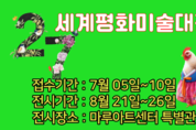 K-민화 이존영 기자 | 2024 제27회 세계평화미술대전이 1~2차 심사를 모두 완료했다. 이번 미술전에서 종합대상(문화체육관광부장관상)에는 강모아(민화)작가, 부문별 대상(서울시장상, 이사장상)에는 조경선(민화), 구상 김영옥(서양화), 비구상 주은영(서양화), 오윤희(한국화). 조진원(캘리)작가가 각각 선정됐다. 이들에게는 상장과 매입 상금이 각각 주어진다. 선정된 작품들은 2024년 8월 21일부터 26일까지 인사동 마루아트센터 지하 1층 특별관에서 입상작 1,250여점 중 550여점이 전시될 예정이다. 전시를 위해 선정된 작가들은 8월 20일 오후 1시부터 4시까지 마루아트센터 지하 1층 세계평화미술대전 전시장으로 작품을 접수하여야 한다. 이번 대전은 평화와 화합을 주제로 전 세계 작가들이 참여하여 다양한 작품을 선보였으며, 심사는 예술계의 권위 있는 심사위원들이 엄격한 기준에 따라 공정하게 진행됐다. 종합대상과 부문별 대상을 포함한 여러 수상작은 평화의 메시지를 담아내며 높은 예술적 가치를 인정받았다. 이번 전시회는 평화의 중요성을 다시 한번 되새기고, 예술을 통해 세계가 하나로 연결될 수 있다는 가능성을 보여주는 귀중한 시간이 될 것이다. 많은